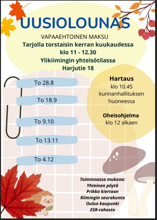 Tervetuloa tämän kevään viimeiselle Uusiolounaalle Ylikiimingin yhteisötilaan to 15.5. klo 11-12.30! Hartaus ennen lounasta klo 10.45. Rempallaan-lauluryhmä laulattaa meitä yhteislauluin klo 12 alkaen, joten älä suotta kiirehdi lounaalta eteenpäin!