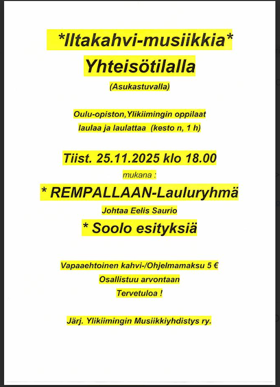 Asukasiltojen aikataulu 23.1. klo 17 Ylikiiminki, Ylikiimingin asukastupa (Harjutie 18)