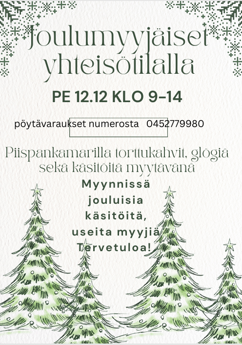 Vappumyyjäiset Yhteisötilalla keskiviikkona 30.04. klo 10 -14 Pöytävaraukset puh. 045 2779980. Pöydän hinta 5 €. TERVETULOA !