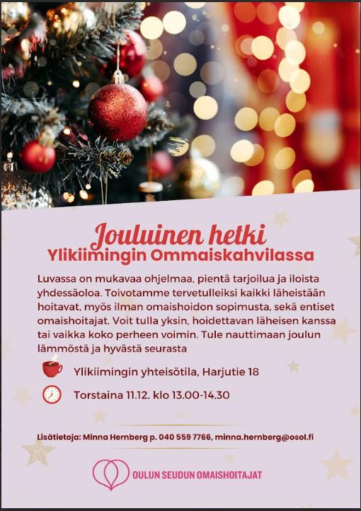 Torstaina 14.3. on yhteisötilassa Prikka uusiolounas ruokailu klo 11 - 13. Lounaan jälkeen on Ommaiskahvila klo 13- 14.30 Ommaiskahvilassa on paikalla asiantuntija Oulun liikuntapalveluista kertomassa toimintakyvyn merkityksestä ja antamassa liikuntavinkkejä. Lisäksi saatavilla ajankohtaista tietoa omaishoidosta. Tervetuloa molempiin tilaisuuksiin !