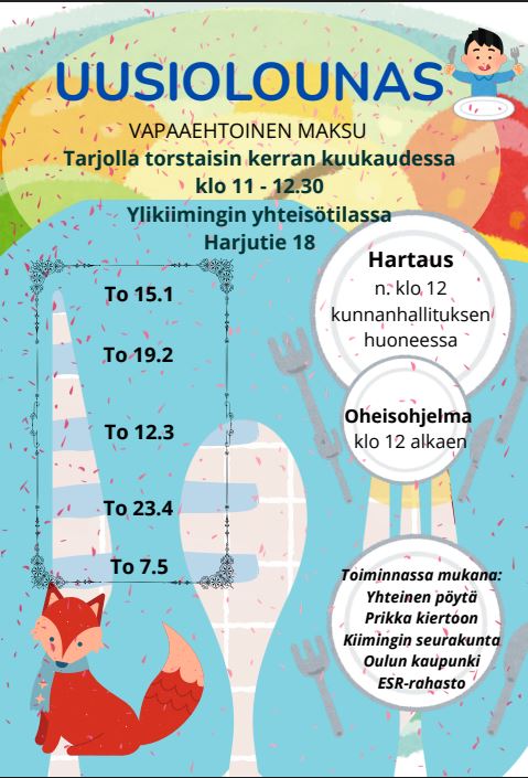 Tervetuloa tämän kevään viimeiselle Uusiolounaalle Ylikiimingin yhteisötilaan to 15.5. klo 11-12.30! Hartaus ennen lounasta klo 10.45. Rempallaan-lauluryhmä laulattaa meitä yhteislauluin klo 12 alkaen, joten älä suotta kiirehdi lounaalta eteenpäin!