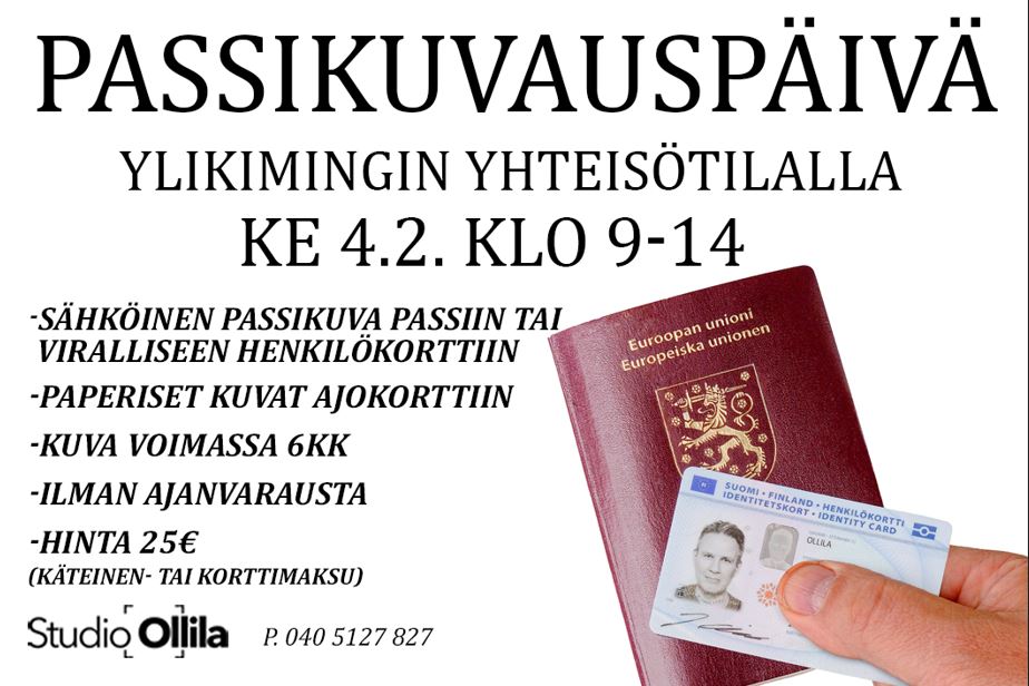 Tarvitsetko kuvaa passia tai henkilökorttia varten. Studio Ollila järjestää Yhteisötilalla kuvauksen 18.3. klo 10 - 14. Myös ajokortti kuvat