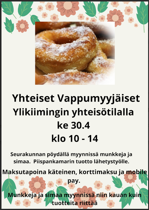 Vappumyyjäiset Yhteisötilalla keskiviikkona 30.04. klo 10 -14 Pöytävaraukset puh. 045 2779980. Pöydän hinta 5 €. TERVETULOA !